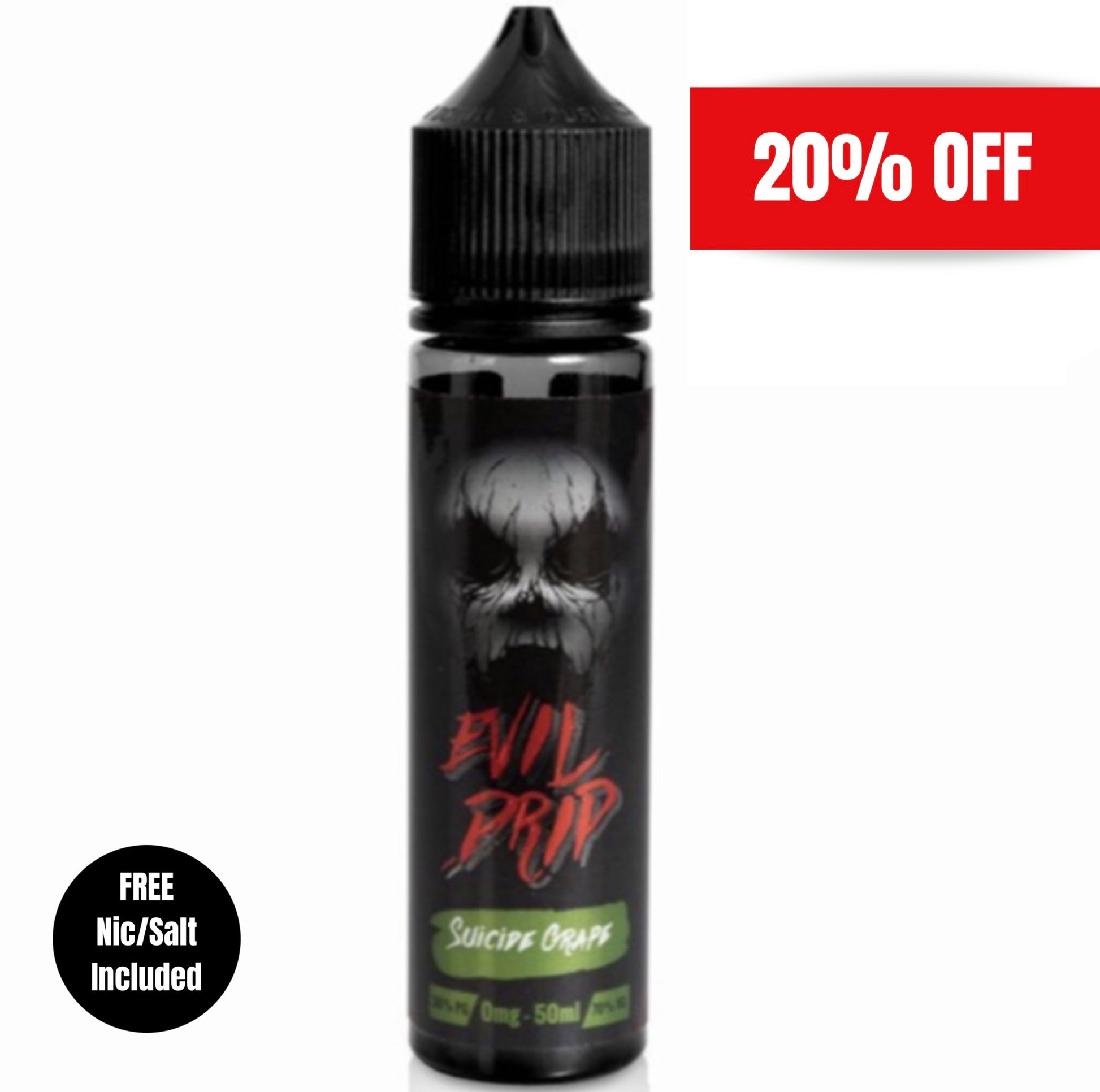Suicide Grape E-Liquid by Evil Drip 50ml Shortfill is a fruit blend with a dark taste, a bittersweet grape flavour is consistent throughout for a simple and tasty grape vape
