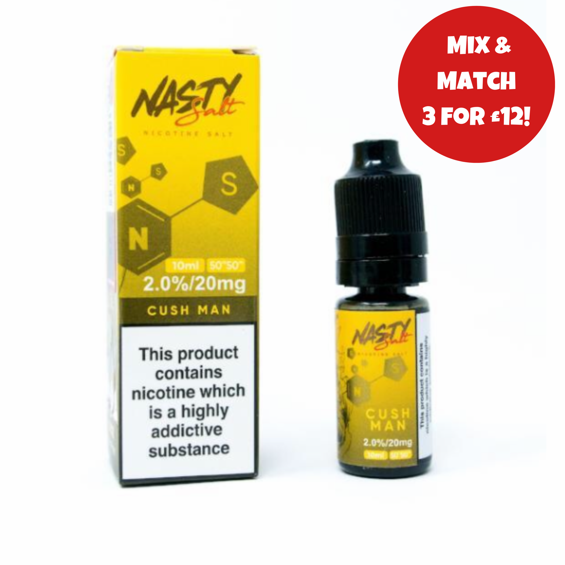 Cush man eLiquid by Nasty Salt is a delicious fresh Mango flavour mixed with some low Mint to give it a subtle cool icy finish